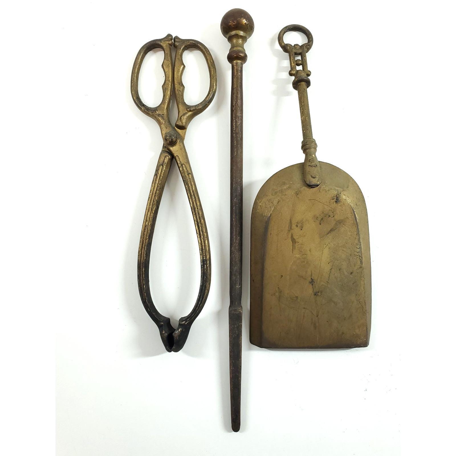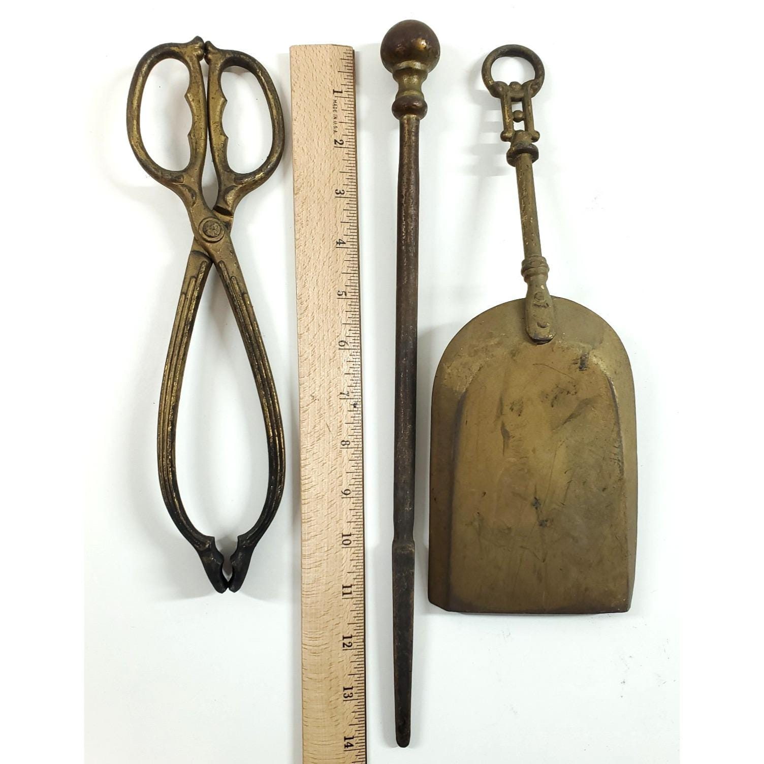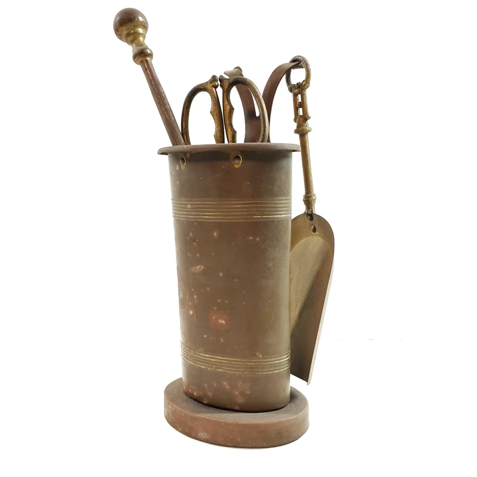 Good sturdy antique condition, with 3 of the original tools included (poker, shovel and tongs). Underside marked Made in England by HS Fabrication, a "Mastercraft" product. Stands about 12" tall, please see all photos for exact detail.