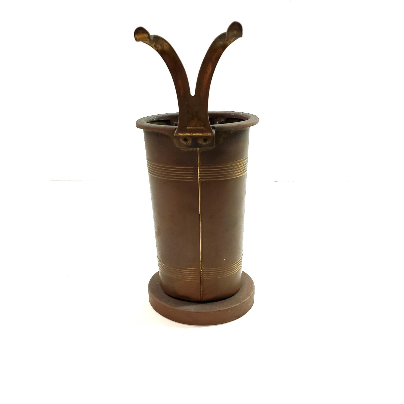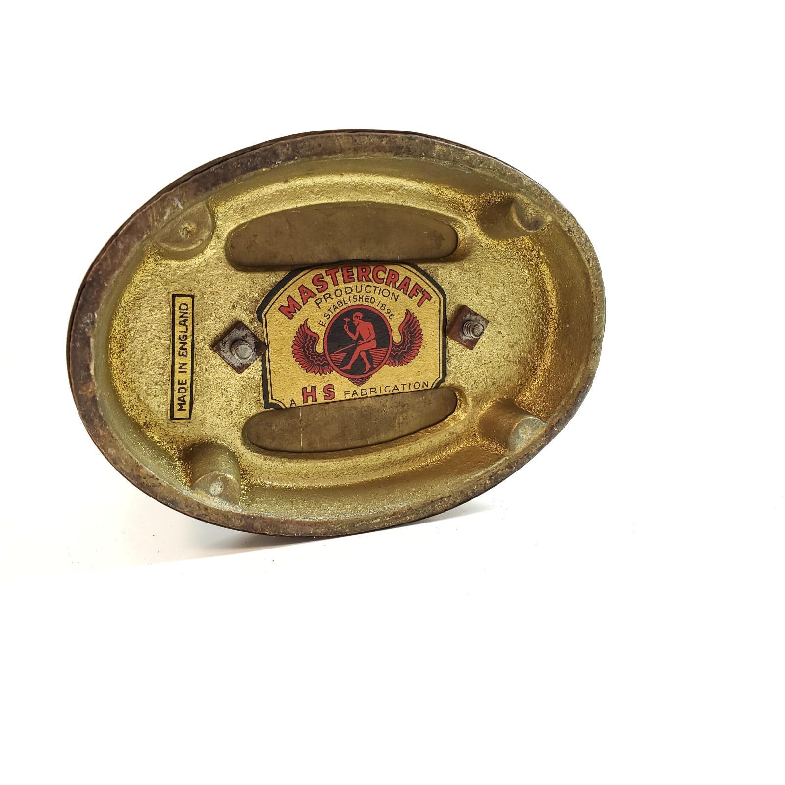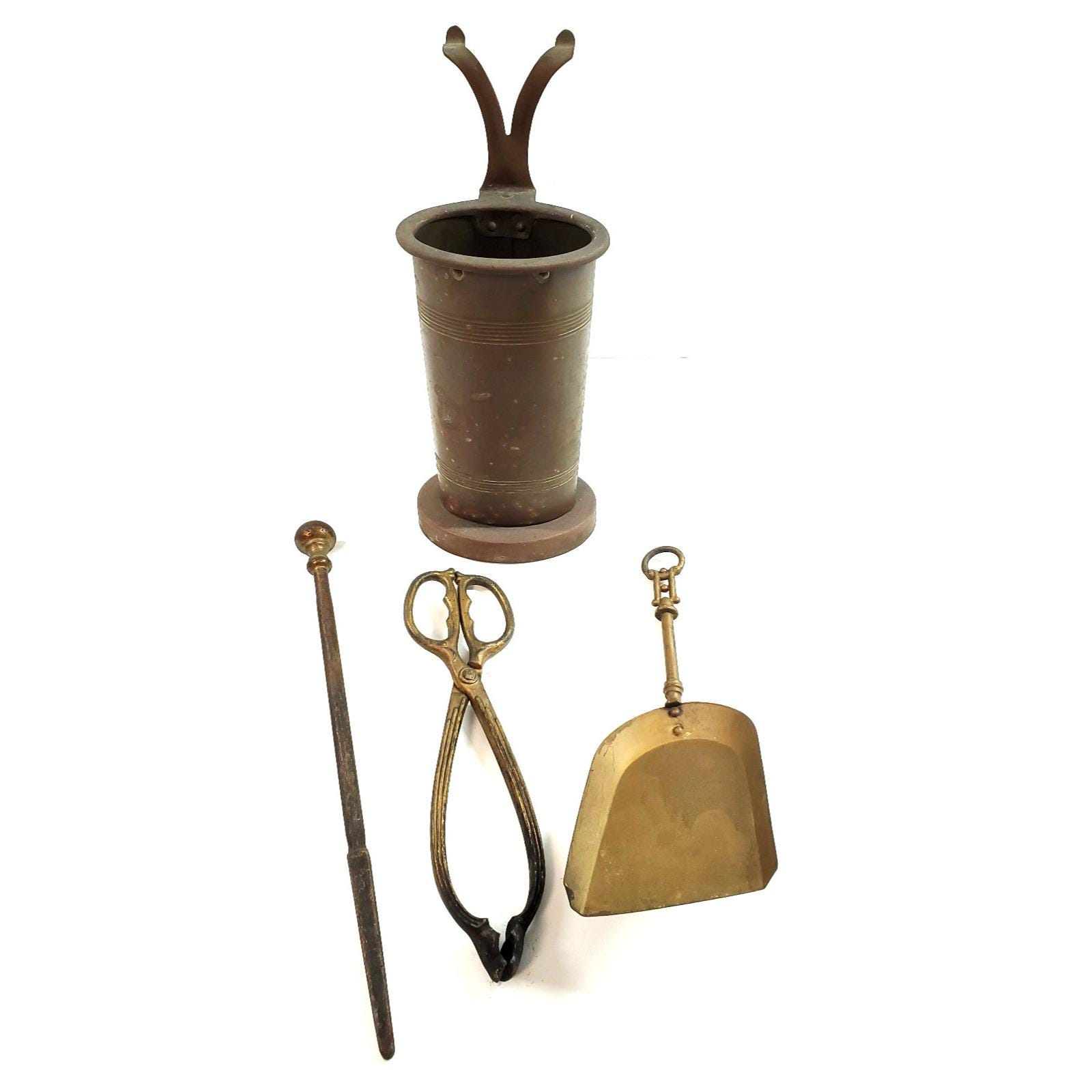 Good sturdy antique condition, with 3 of the original tools included (poker, shovel and tongs). Underside marked Made in England by HS Fabrication, a "Mastercraft" product. Stands about 12" tall, please see all photos for exact detail.