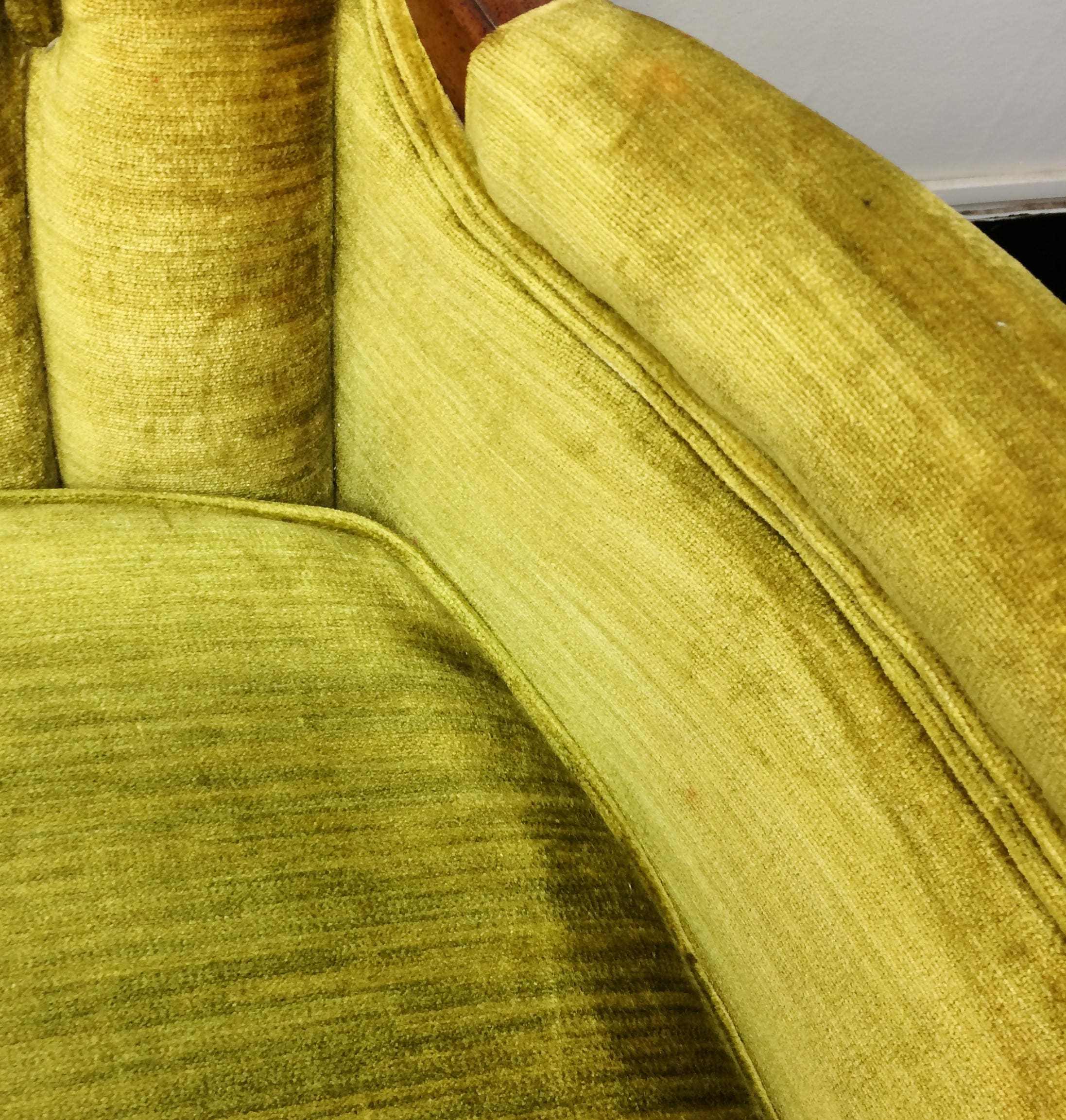 The chair is in very good cosmetic condition with no rips or tears in the upholstery. There is one very small, barely noticeable, spot on the left armrest and the fabric has pulled away slightly on the back. Please see photos for details.